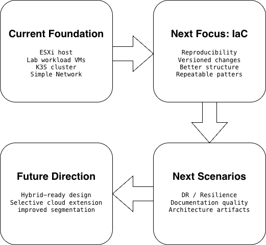The most important next step is infrastructure as code. The ESXi host already gives me a useful base, but I want to push the environment toward more reproducible and versioned ways of working. That is the shift that starts turning a lab from something operational into something closer to a real architecture portfolio.